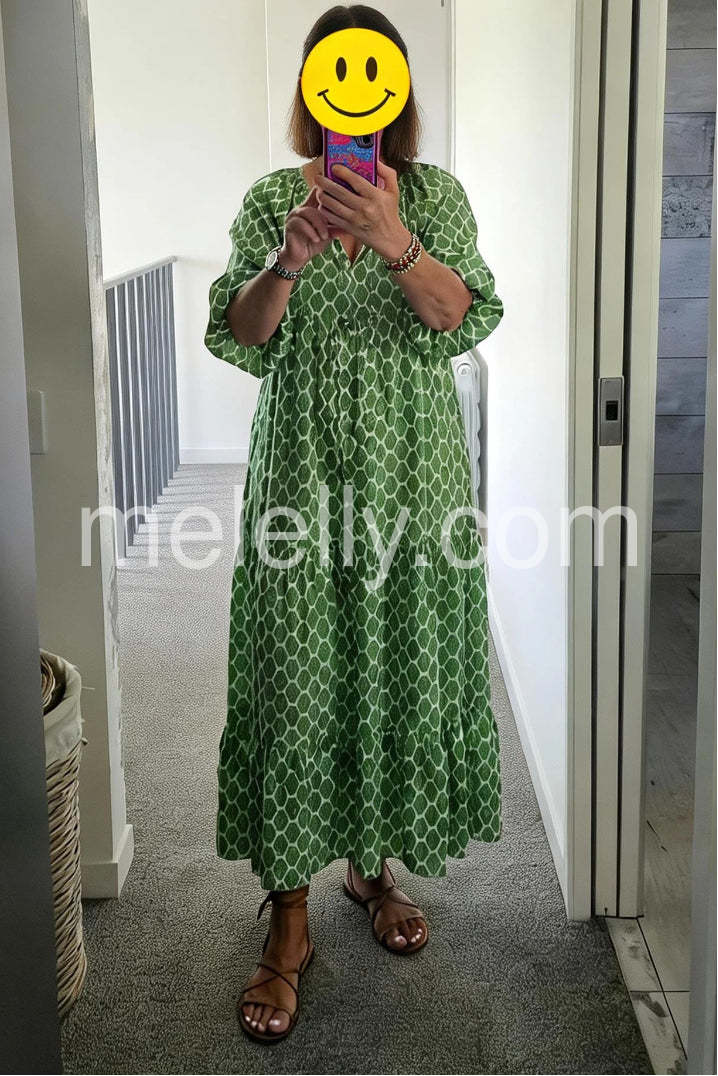 Get ready to turn heads everywhere you go in this above-the-ankle, vibrant green and white honeycomb print maxi dress! This laid-back and elegant dress is perfect for taking a stroll through your local farmer's market, making your way through a museum, or lunch with friends.