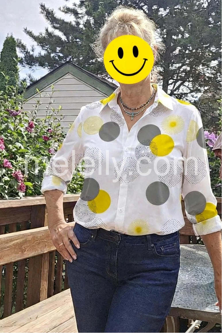 This stylish white button-down blouse brings a fresh, contemporary twist to classic tailoring with its eye-catching geometric print. Featuring a bold mix of vibrant yellow circles, soft gray dots, and intricate black diamond patterns, the design adds playful sophistication to any outfit. Crafted from lightweight, smooth fabric—likely satin or viscose—it drapes elegantly while maintaining a crisp silhouette. The shirt has a clean V-neckline, long sleeves that can be rolled up for a relaxed look, and a full front button closure for timeless versatility. Paired with dark jeans or tailored trousers, it’s perfect for casual outings, office wear, or smart-casual events. Its modern aesthetic makes it a standout piece that balances artful design with everyday comfort. Ideal for those who love to express creativity through fashion with a touch of minimalist charm.