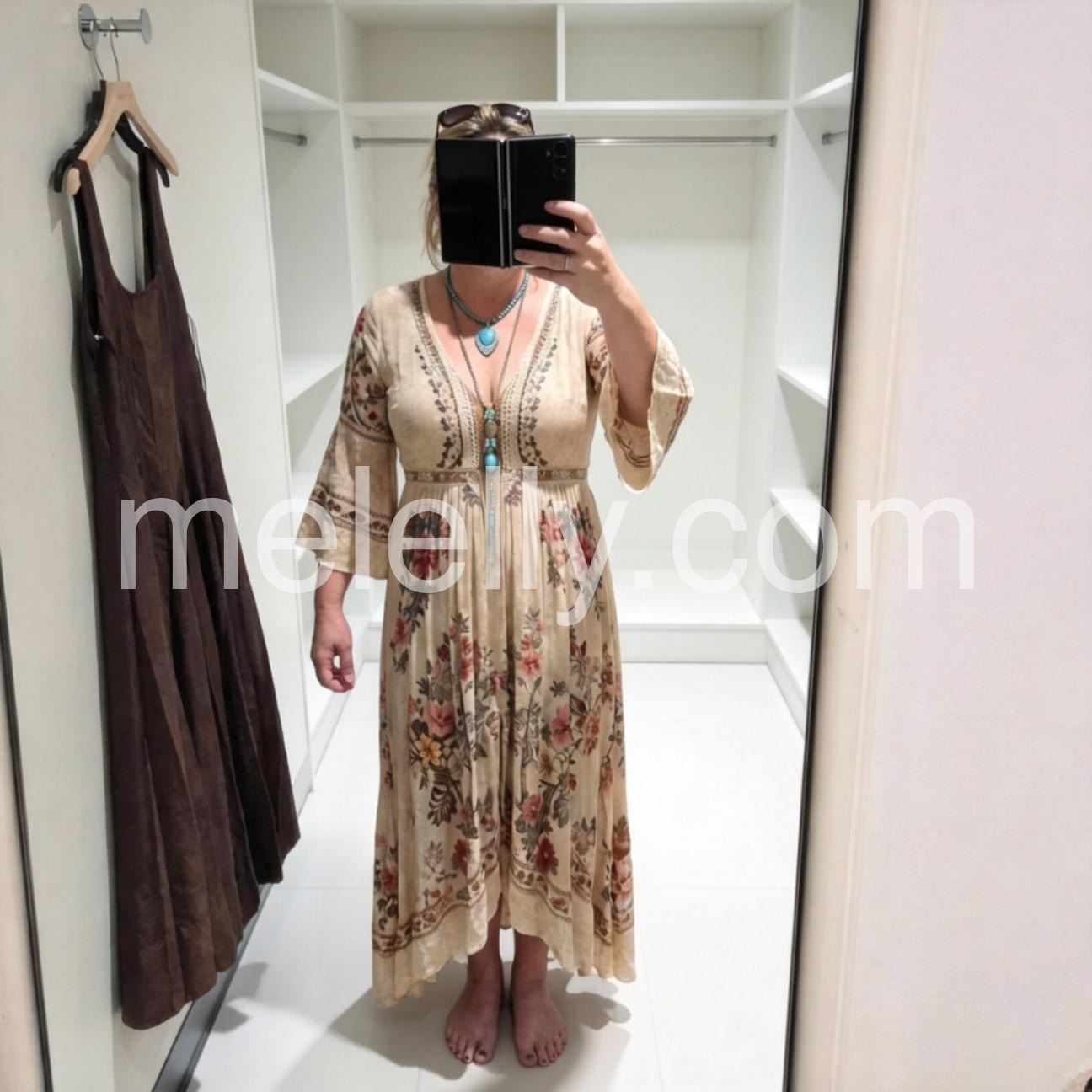 This Retro 3/4 Sleeve Beige Midi Dress combines timeless elegance with comfortable wearability. Its classic beige tone and modest midi length make it versatile for various occasions, while the 3/4 sleeves offer a balanced blend of coverage and style. Crafted to flatter a range of silhouettes, this dress is an expert choice for those seeking understated sophistication with a vintage-inspired touch.